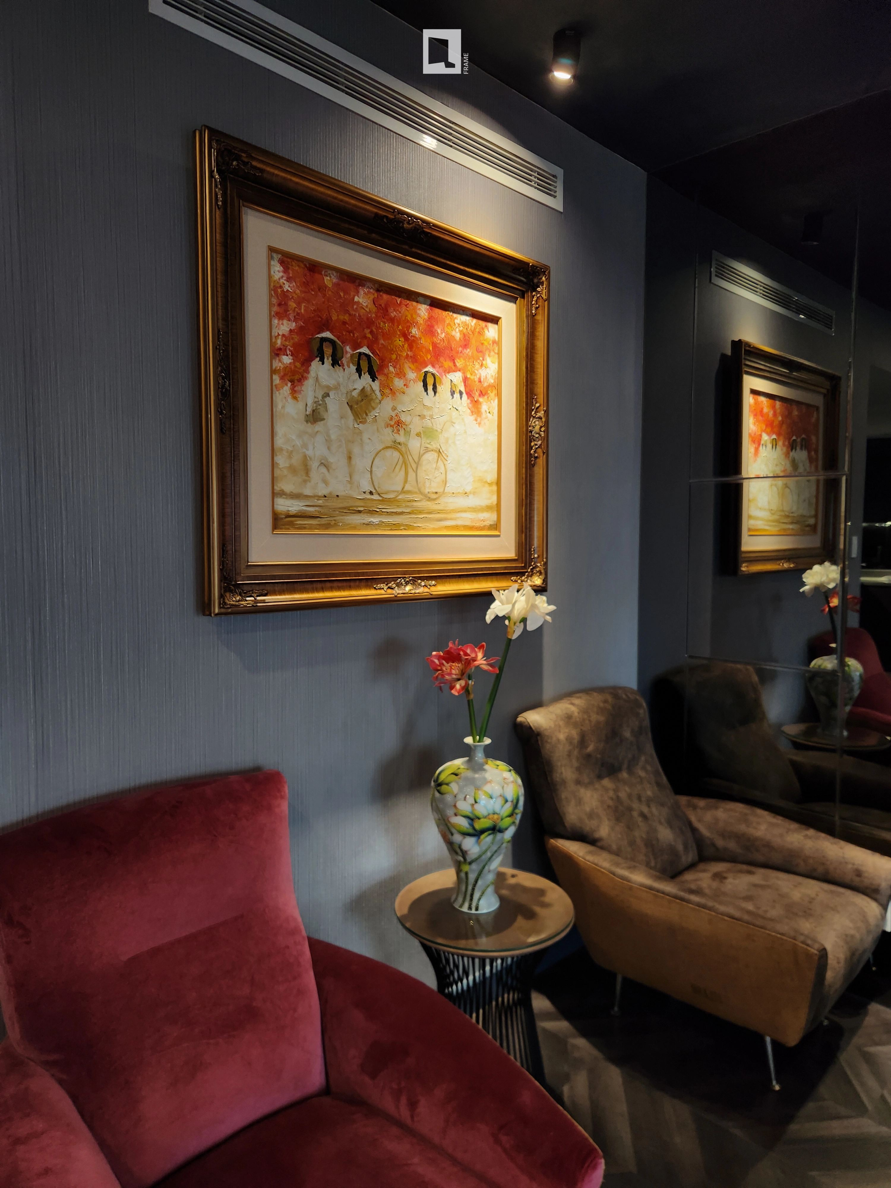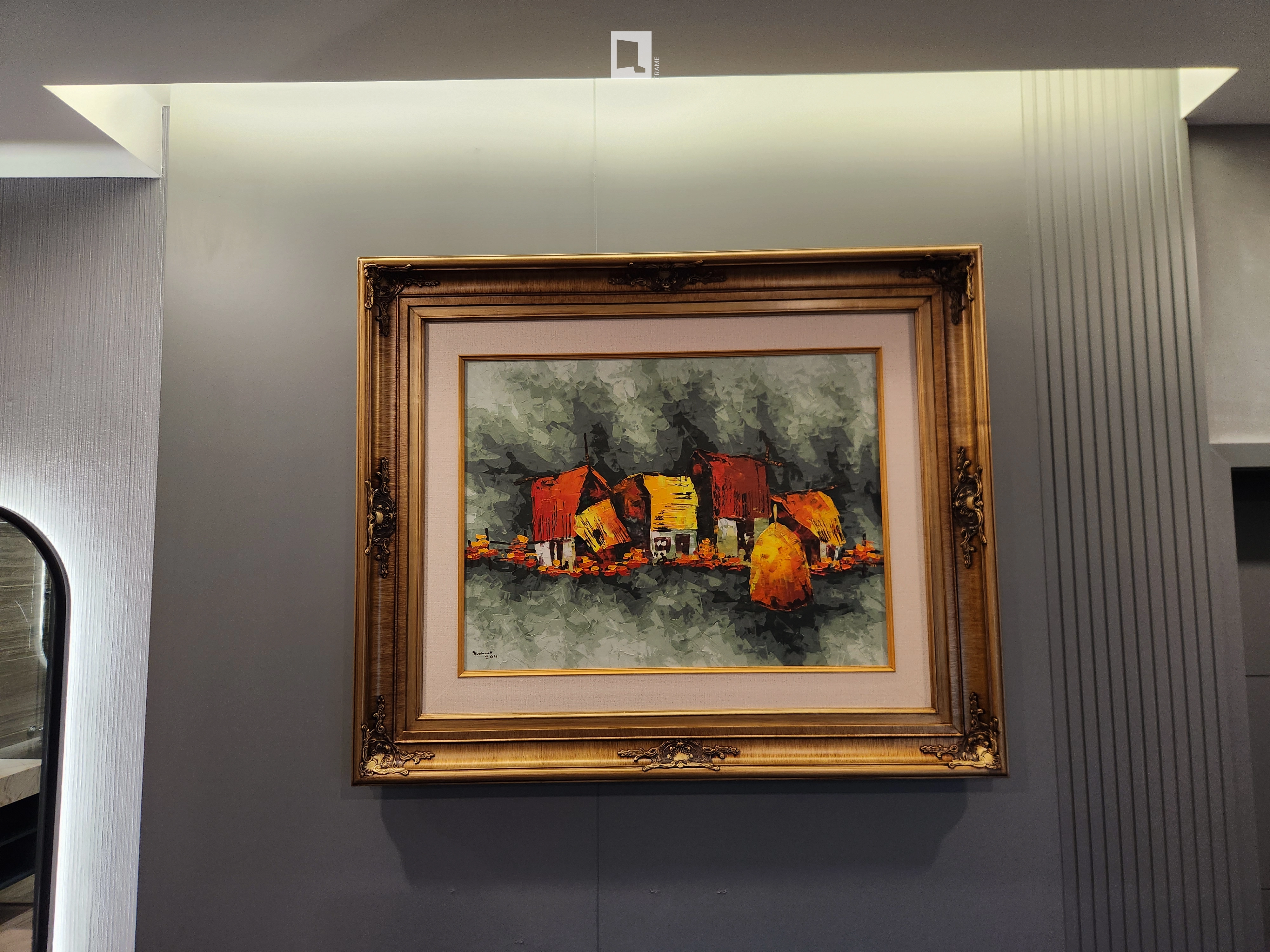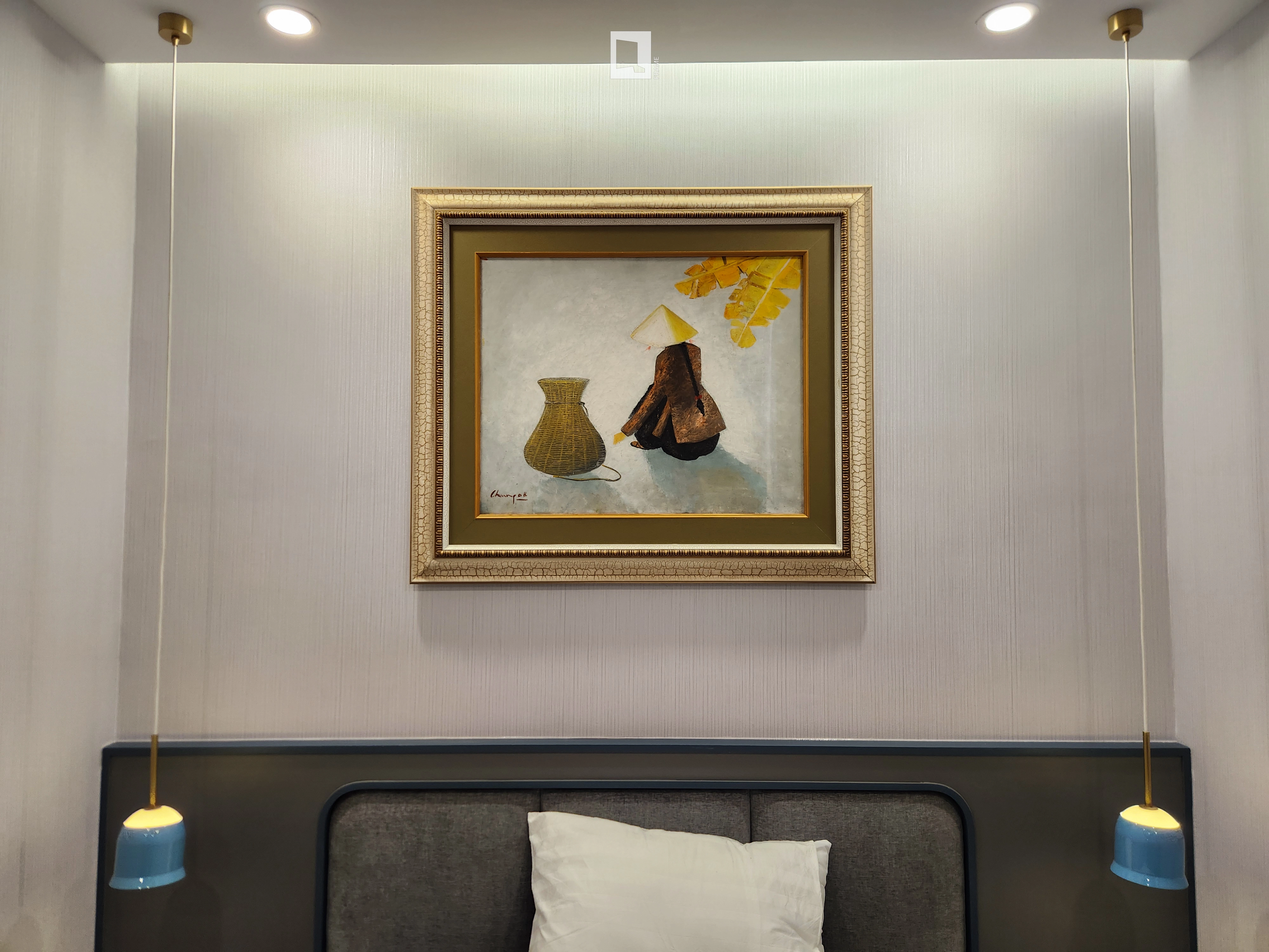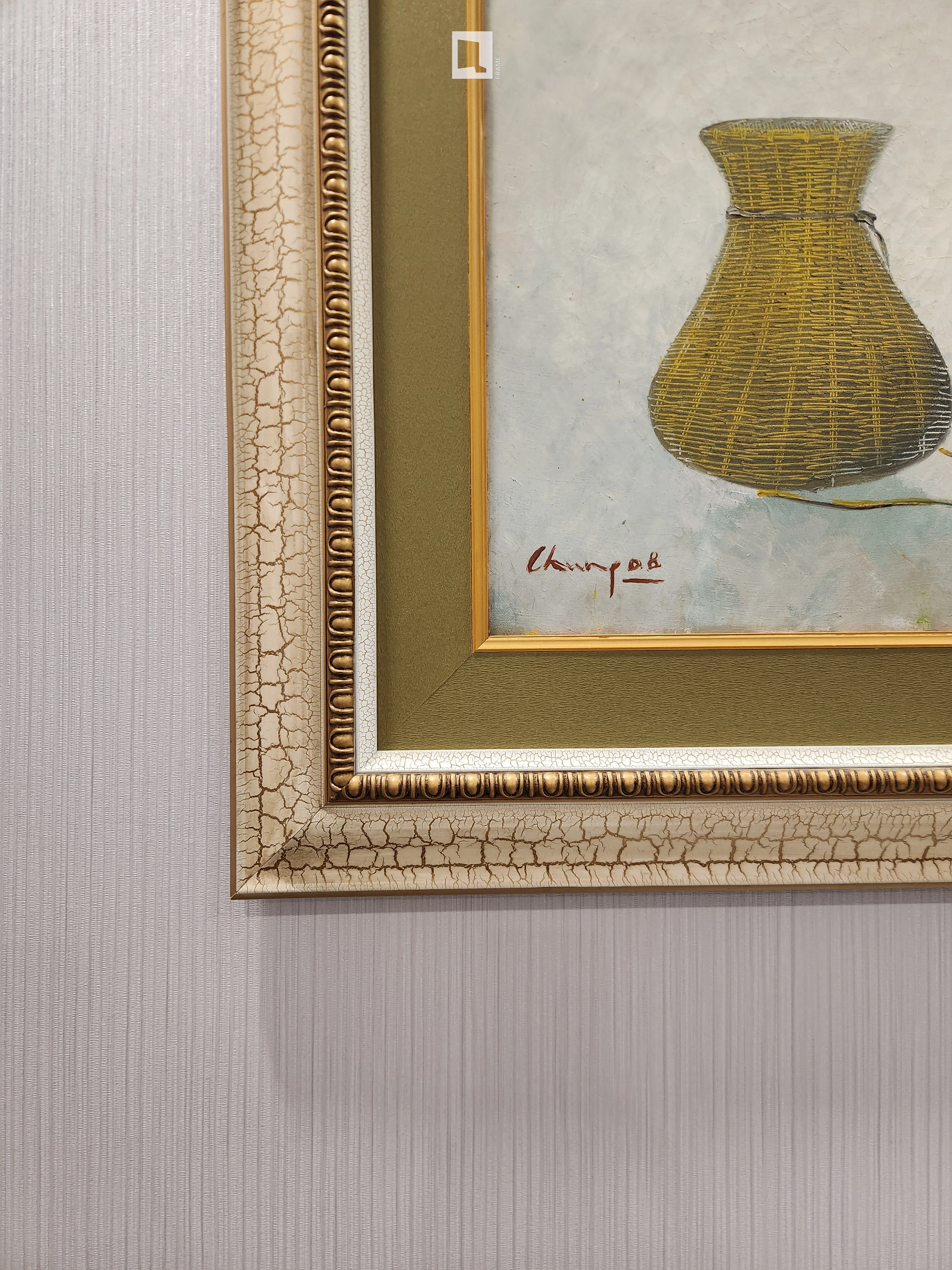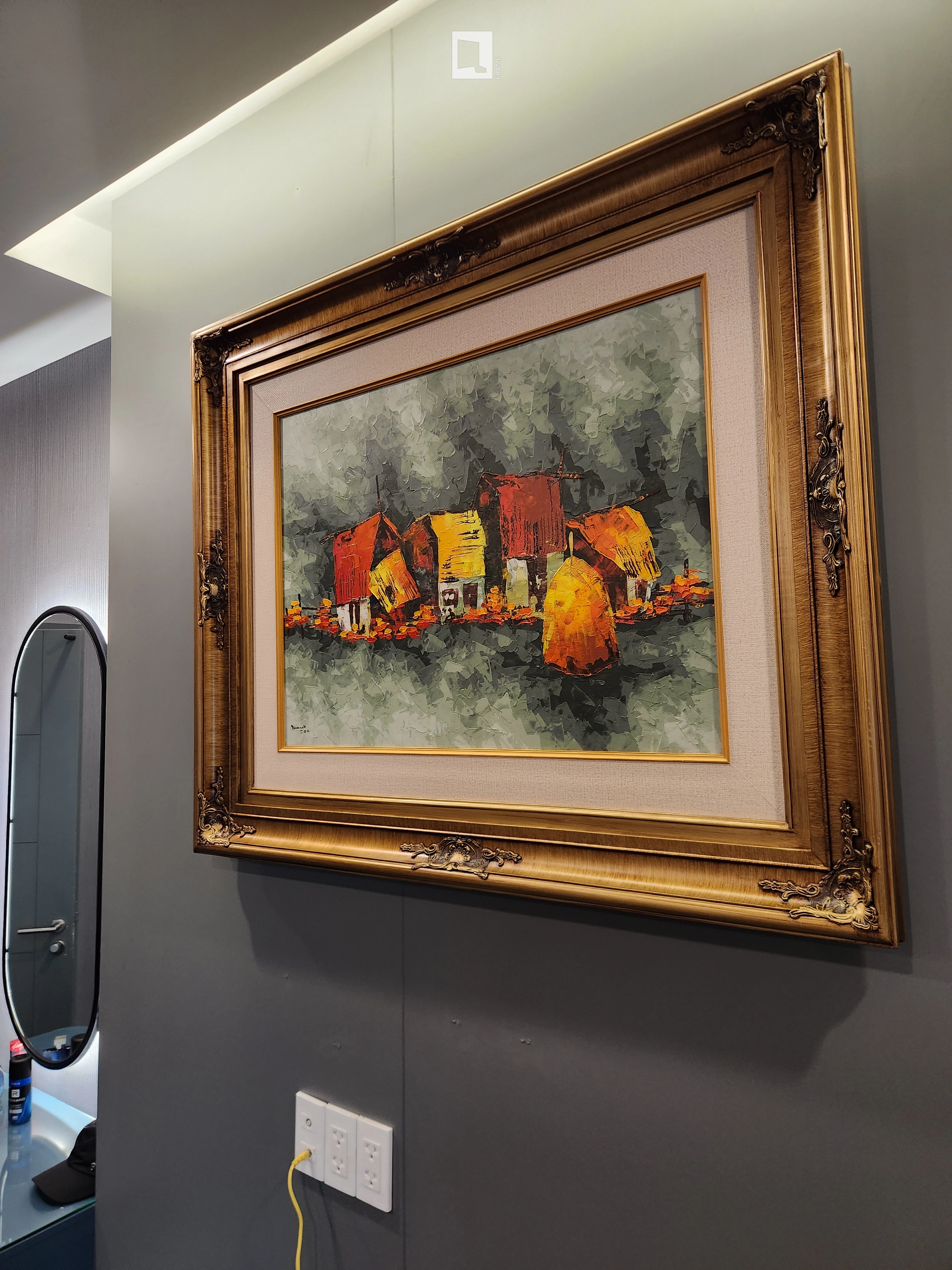 Trong dự án tại Sailing Tower, việc hoàn thiện khung tranh được triển khai dựa trên cách các tác phẩm hiện diện trong không gian sống hằng ngày. Ở phòng khách và khu sinh hoạt, khung tông vàng đồng trầm, phủ patina nâu nhẹ, góc có họa tiết cổ điển tiết chế. Màu vàng ngả đồng giúp ăn với nền tường xám và sàn gỗ tối, đồng thời kéo lại độ ấm của các điểm nhấn nội thất mà không làm tranh bị “lạc” khỏi không gian. Với tác phẩm treo phòng ngủ, lựa chọn chuyển sang khung nền kem xử lý hiệu ứng crackle, kèm viền gân và lớp bo xanh olive. Cấu trúc nhiều lớp giúp tranh giấy có chiều sâu thị giác, tách nền vừa đủ, giữ cảm giác yên tĩnh của phòng.